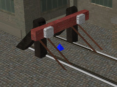Description: Wooden buffer stop from MS&LR/GC type drawing, the buffer structure sits just beyond the end of the rail and is secured to a timber baulk underground. This version acts as a signal. |